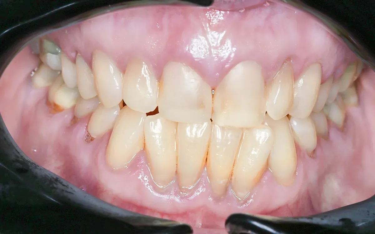 Mrs C, a self-confessed coffee lover, came to us seeking an aesthetic refresh for her smile. Years ago, composite restorations were placed on her front teeth (11 and 21) to improve their appearance. Over time, these restorations had discoloured and no longer blended naturally with the rest of her teeth, leaving her self-conscious whenever she smiled.